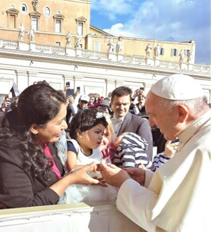 ബുധനാഴ്ചത്തെ പൊതുദര്ശന ശുശ്രുഷാവേളയില് തീര്ത്തും ആകസ്മികമായി മാര്പ്പാപ്പയുടെ ഒരു സെക്യൂരിറ്റി അടുത്തു വന്ന് പ്രാര്ത്ഥനാ മോളെയും മാതാപിതാക്കളെയും വിളിച്ചു കൊണ്ടുപോയി ഏറ്റവും മുന്നിലത്തെ നിരയില്ത്തന്നെ ഇരിക്കുവാന് ഒരു വേദി നല്കുക, ഫ്രാന്സീസ് മാര്പ്പാപ്പ വന്നു കയ്യും പിടിച്ചു ചുംബനവും,തലോടലും നല്കി,തലയില് കുരിശുവരച്ചു അനുഗ്രഹിക്കുകയും കൂടാതെ പോക്കറ്റില് നിന്നും രണ്ടു കൊന്ത എടുത്തു സമ്മാനവും തങ്ങളുടെ മോള്ക്ക് നല്കുക കൂടിയാവുമ്പോള് ഇതില്പ്പരം എന്ത് സന്തോഷാനുഗ്രഹമാണ് നേടുവാനെന്ന് പാലാട്ടി കുടുംബം.