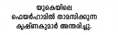 കുഴഞ്ഞു വീണു മരിക്കുകയായിരുന്നു. ബാഡ്മിന്റണ് കളി കഴിഞ്ഞ് വീട്ടില് തിരിച്ചെത്തിയ ശേഷമാണ് മരണം സംഭവിച്ചത്. ഒരു വര്ഷം മുമ്പാണ് കൃഷ്ണകുമാര് യുകെയില് എത്തിയത്. ഭാര്യ സൗമ്യ തൃശൂരുകാരിയാണ്. രണ്ടു മക്കളുണ്ട്. പൂര്ണ ആരോഗ്യവാനായിരുന്ന കൃഷ്ണകുമാര് വീട്ടിലെത്തി വിശ്രമിക്കവേ അസ്വസ്ഥത തോന്നുകയും പിന്നാലെ കുഴഞ്ഞു വീഴുകയും പിന്നാലെ മരണത്തിന് കീഴടങ്ങുകയും ആയിരുന്നു. ഐടി കമ്പനിയില് ജോലി ചെയ്യുകയായിരുന്ന കൃഷ്ണകുമാര് നാട്ടില് ഗുരുവായൂര് സ്വദേശിയാണ്. |