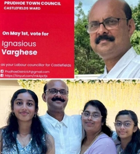 എറണാകുളം ജില്ലയിലെ അങ്കമാലി നെടുമ്പാശ്ശേരി സ്വദേശിയായ ഇഗ്നേഷ്യസ് വര്ഗീസ് യുകെയിലെ പ്രാദേശിക കൗണ്സില് തിരഞ്ഞെടുപ്പില് മൂന്നാം തവണയും എതിരില്ലാതെ കൗണ്സിലറായി. 2006ല് യുകെയിലെ ന്യൂകാസിലില് എത്തിയ ഇഗ്നേഷ്യസ് വര്ഗീസ് റോയല് മെയിലില് ആണ് ജോലി ചെയ്യുന്നത്.