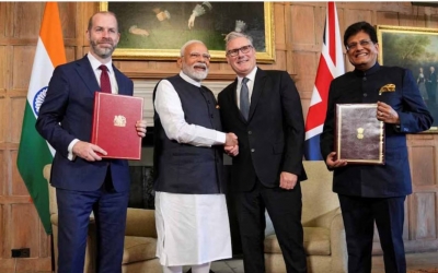 ലണ്ടന്: സ്വതന്ത്ര വ്യാപാരക്കരാറില് ഒപ്പുവച്ച് ഇന്ത്യയും യുകെയും. പ്രധാനമന്ത്രി നരേന്ദ്ര മോദിയുടെ ദ്വിദിന യുകെ സന്ദര്ശനവേളയിലാണ് ഇരുരാജ്യങ്ങളും ചരിത്രപരമായ കരാറില് ഒപ്പുവച്ചത്. മോദിയുടെയും യുകെ പ്രധാനമന്ത്രി കിയ സ്റ്റാമറുടെയും സാന്നിധ്യത്തില് കേന്ദ്ര വാണിജ്യ മന്ത്രി പീയുഷ് ഗോയല്, ബ്രിട്ടിഷ് വാണിജ്യ മന്ത്രി ജൊനാഥന് റെയ്നോള്ഡ്സ് എന്നിവര് കരാറില് ഒപ്പിട്ടു. 2030 ഓടെ ഇരുരാജ്യങ്ങളും തമ്മിലുള്ള ഉഭയകക്ഷി വ്യാപാരം 12,000 കോടി ഡോളറാക്കി (10.36 ലക്ഷം കോടി രൂപ) വര്ധിപ്പിക്കുന്നത് ലക്ഷ്യമിടുന്നതാണ് കരാര്. സാമ്പത്തിക വളര്ച്ചയ്ക്കും തൊഴിലവസരങ്ങള് സൃഷ്ടിക്കുന്നതിലും പുതിയ മാര്ഗങ്ങള് സൃഷ്ടിക്കുന്ന കരാര് ഇന്ത്യയിലെ യുവാക്കള്ക്കും കര്ഷകര്ക്കും ഗുണം ചെയ്യുമെന്നാണ് പ്രതീക്ഷ.