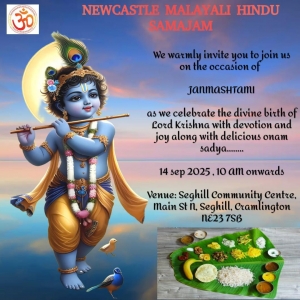 ഈ വരുന്ന ഞായറാഴ്ച സെപ്റ്റംബര് മാസം പതിനാലാം തീയതി രാവിലെ 10 മണി മുതല് ന്യൂ കാസില് സെജ് ഹില് കമ്മ്യൂണിറ്റി ഹാളില് അതിവിപുലമായ പരിപാടികളോടുകൂടിയാണ് ശ്രീകൃഷ്ണ ജയന്തി ആഘോഷങ്ങള് ഒരുക്കിയിരിക്കുന്നത്. ഉണ്ണിക്കണ്ണന് മാരും കുഞ്ഞു രാധമാരും അണിഞ്ഞൊരുങ്ങി അന്നേദിവസം എത്തിച്ചേരുന്നതിന് വേണ്ടിയുള്ള വിപുലമായ പ്രവര്ത്തനങ്ങള് നടന്നു വരുന്നു. താലപ്പൊലി, പഞ്ചവാദ്യം സോപാനസംഗീതം, നാമജപം, ആരതി, ഉറിയടി, വിഭവ സമൃദ്ധമായ ഓണസദ്യ എന്നിങ്ങനെ അതി വിപുലമായ രീതിയിലാണ് ഈ വര്ഷത്തെ ശ്രീകൃഷ്ണ ജന്മാഷ്ടമി പരിപാടികള് സംഘടിപ്പിച്ചിരിക്കുന്നത്. നോര്ത്ത് ഈസ്റ്റ് കേരള ഹിന്ദു സമാജം (uk) ത്തിന്റെ കൂടി സഹകരണത്തോടെ സംഘടിപ്പിക്കുന്ന ശ്രീകൃഷ്ണ ജയന്തി ആഘോഷങ്ങളില് എല്ലാ കുടുംബാംഗങ്ങളും കുട്ടികളുമായി സകുടുംബം കൃത്യ സമയത്ത് തന്നെ പങ്കെടുത്ത പരിപാടികള് നല്ല നിലയില് ഭക്തിസാന്ദ്രമായി നടത്തുവാന് സഹകരിക്കണമെന്ന് സംഘാടകസമിതി അറിയിക്കുന്നു. പരിപാടി നടക്കുന്ന സ്ഥലം-Seg hill community centre Cramlington NE23 7SB Contact - Sreejith kurup-07916751283 Kapil Karthikeyan-07436375743 Anilkumar-07828218916.