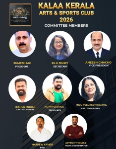 കലാ കേരള ആര്ട്സ് ആന്ഡ് സ്പോര്ട്സ് ക്ലബിന്റെ 2026-ലെ പുതിയ ഭരണസമിതിയെ പ്രഖ്യാപിച്ചു. സുമേഷ് എം.കെ (പ്രസിഡന്റ്), സിലു ജിമ്മി (സെക്രട്ടറി), അനീഷ് ചാക്കോ (വൈസ് പ്രസിഡന്റ്), മിധുന് മോഹന് (ജോയിന്റ് സെക്രട്ടറി), ആല്ഫി ജോര്ജ് (ട്രഷറര്), ഇന്ദു വെള്ളിക്കോത്തിടത്തില് (ജോയിന്റ് ട്രഷറര്) എന്നിവരാണ് പ്രധാന ഭാരവാഹികള്. മാത്യൂസ് പാല പിആര്ഒയായും ജയേഷ് തോമസ് മീഡിയ കോഓര്ഡിനേറ്ററായും ചുമതലയേറ്റു.