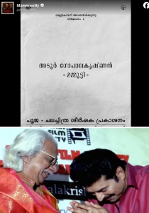 ഇത് നാലാം തവണയാണ് മമ്മൂട്ടിയും അടൂരും ഒന്നിക്കുന്നത്. 1987 ല് പുറത്തിറങ്ങിയ അനന്തരം എന്ന സിനിമയിലാണ് ആദ്യമായി അടൂരും മമ്മൂട്ടിയും ഒന്നിച്ചത്. തുടര്ന്ന് വിധേയന്, മതിലുകള് എന്നീ സിനിമകളിലും ഇരുവരും ഒന്നിച്ചു. മതിലുകളില് വൈക്കം മുഹമ്മദ് ബഷീറായും വിധേയനില് വില്ലനായ ഭാസ്കര പട്ടേലര് എന്ന ജന്മിയെയാണ് മമ്മൂട്ടി അവതരിപ്പിച്ചത്. 2016 ല് പുറത്തിറങ്ങിയ പിന്നെയും ആണ് അടൂരിന്റെ സംവിധാനത്തില് പുറത്തിറങ്ങിയ അവസാനത്തെ സിനിമ.