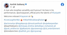 അഭിനയത്തില് വൈവിധ്യതയും നര്മ്മവും ജീവശ്വാസമാക്കിയ മനുഷ്യന്, സൂര്യ44ന്റെ പ്രതിഭകള്ക്കൊപ്പം ജയറാമും. ജയറാം സാറിന് സ്വാഗതം എന്നാണ് പോസ്റ്ററിനൊപ്പം കാര്ത്തിക് |