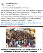 തിരുവനന്തപുരം ജില്ലയിലെ മൂന്ന് ഷോറൂമുകളില്നിന്ന് ഒറ്റ ദിവസം കൊണ്ട് 250 കിലോ സ്വര്ണവും 400 കാരറ്റ് വജ്രവും എം.ജി.റോഡ് ഷോറൂമില്നിന്ന് 160 കിലോ സ്വര്ണവും 320 കാരറ്റ് ഡയമണ്ട് വില്പനയും നടത്തി. സ്വര്ണ്ണത്തില് മാറുന്ന കാലത്തിനോട് പൊരുത്തപ്പെടേണ്ടതിന്റെ പ്രാധാന്യമാണിതെന്ന് ഭീമ ചെയര്മാന് ഡോ. ബി. ഗോവിന്ദന് പറഞ്ഞു.