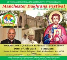 യു കെയിലെ ഏറ്റവും പ്രസിദ്ധവും പുരാതനവുമായ മാര് തോമാശ്ലീഹായുടെയും, വി. അല്ഫോന്സയുടെയും നാമധേയത്തിലുള്ള ഒരാഴ്ച നീളുന്ന മാഞ്ചസ്റ്റര് ദുക്റാന തിരുനാളിന് തുടക്കം കുറിച്ച് കൊണ്ട് ഷ്രൂസ്ബറി രൂപതാ മെത്രാന് ബിഷപ്പ് മാര്ക്ക് ഡേവിസ് ഞായറാഴ്ച കൊടിയേറ്റും. പ്രധാന തിരുനാള് ജൂലൈ ഒന്നിന് ആയിരിക്കും