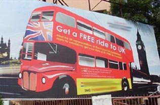 ലണ്ടന് : ലണ്ടനിലെ പ്രശസ്തമായ ഡബിള് ഡെക്കര് ബസിന്റെ ചിത്രം ഉപയോഗിച്ച് തട്ടിപ്പിനുള്ള പരസ്യം നല്കി. ഇന്ത്യയിലാണ് ഇത്തരത്തിലുള്ള കൂറ്റന് പരസ്യ ബോര്ഡ് പ്രത്യക്ഷപ്പെട്ടത്. വ്യാജ സ്റ്റുഡന്റ് വിസയാണ് ഇവര് നല്കുന്നത്. യുകെയിലേക്ക് സൗജന്യ പ്രവേശനം വാഗ്ദാനം ചെയ്ത് വിദ്യാര്ഥികളെ വഞ്ചിക്കുന്നതാണ് പരിപാടി.