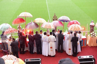 ചെറുതായി മഴ പെയ്തു തുടങ്ങിയപ്പോള് തിരുക്കര്മ്മങ്ങള് തടസപ്പെടുമോ എന്ന് പോലും ചിലര് ഭയപ്പെട്ടു. പുതിയ മെത്രാന് പ്രധാന കാര്മികനായി വി. കുര്ബ്ബാനയര്പ്പണം, അതിന്റെ ഏറ്റവും പ്രധാന ഭാഗമായ കൂദാശാ വചനങ്ങളിലേക്കെത്തിയപ്പോളായിരുന്നു മഴ പൊടിഞ്ഞത്. എന്നാല് സ്റ്റേഡിയത്തില് തിങ്ങിക്കൂടിയ വിശ്വാസികള് എല്ലാവരും ആത്മാര്ത്ഥമായി പ്രാര്ത്ഥിച്ചു. വി. കുര്ബ്ബാനയര്പ്പണത്തിന്റെ പ്രധാന ഭാഗമെത്തിയപ്പോള് മാത്രം ചാറിയ മഴ ബലിയര്പ്പണത്തിന് ദൈവത്തിന്റെ അംഗീകാരമായി വിശ്വാസികള് കണക്കാക്കി.