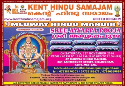 കെന്റ് ഹിന്ദു സമാജത്തിന്റെ ആഭിമുഖ്യത്തില് ഈ വര്ഷ ത്തെ അയ്യപ്പപൂജ നവംബര് 26 ന് വൈകുന്നേരം 4 മണി മുതല് 10 മണി വരെ കെന്റിലെ മെഡ്വേ ഹിന്ദു മന്ദിറില് വച്ച് നടത്തപ്പെടുന്നു. അയ്യപ്പപൂജയോടനുബന്ധിച്ചു ഭജന, വിളക്കുപൂജ, നെയ്യഭിഷേകം, താലപ്പൊലി, സഹസ്രനാമാര്ച്ചുന, അഷ്ടോത്തര അര്ച്ച ന, ശനിദോഷ പരിഹാരം (നീരാന്ജനം), ദീപാരാധന, പടിപൂജ, ഹരിവരാസനം, പ്രസാദവിതരണം, അന്നദാനം എന്നിവയും ഉണ്ടായിരിക്കുന്നതാണ്. വിളക്കുപൂജയില് പങ്കെടുക്കുന്നവര് നിലവിളക്കും നാളികേരവും പൂജാപുഷ്പങ്ങളും കൊണ്ടുവരേണ്ടതാണ്.