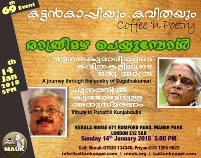 പുതുവര്ഷത്തിലെ ആദ്യ പരിപാടിയുമായി ലണ്ടനിലുള്ള കലാ സാഹിത്യ കൂട്ടായ്മ 'കട്ടന് കാപ്പിയും കവിത'യും ജനുവരി 14ന് വീണ്ടും ഒത്തുകൂടുന്നു . മലയാളി അസോസിയേഷന് ഓഫ് ദി യു .കെ.' യുടെ ആഭിമുഖ്യത്തില് , ലണ്ടനിലെ മനോപാര്ക്കിലുള്ള 'കേരള ഹൗസി'ല് വെച്ച് , രണ്ട് പരിപാടികളുമായിട്ടാണ് , അന്ന് വൈകീട്ട് 5 മണി മുതല് ഇതിനു വേണ്ടി വേദിയൊരുക്കുന്നത് .