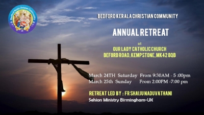 ഈസ്റ്റ് ആംഗ്ലിയായിലെ സീറോ മലബാര് കുര്ബ്ബാന കേന്ദ്രങ്ങളിലൊന്നായ ബെഡ്ഫോര്ഡില് കേരള ക്രിസ്ത്യന് കമ്മ്യുണിറ്റിയുടെ നേതൃത്വത്തില് വാര്ഷീക ധ്യാനം സംഘടിപ്പിക്കുന്നു. യു കെ യിലെ പ്രശസ്ത തിരുവചന ശുശ്രുഷാ കേന്ദ്രമായ സെഹിയോന് മിനിസ്ട്രിയിലെ ധ്യാന ഗുരുവും, ആല്മീയ ചിന്തകനും ആയ ഫാ. ഷൈജു നടുവത്താനിയാണ് 24 ,25 തീയതികളിലായി ബെഡ്ഫോര്ഡില് നടത്തുന്ന വചന ശുശ്രുഷ നയിക്കുന്നത്.