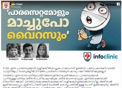 പാരസെറ്റാമോളില് ബൊളിവിയന് ഹെമറേജിക് ഫീവറിന് കാരണമായ മാച്ചുപോ വൈറസ് ഉണ്ടെന്നായിരുന്നു ദിവസങ്ങളായി പ്രചരിച്ചിരുന്ന കിംവദന്തി. ഫെയ്സ്ബുക്കിലെ ഡോക്ടര്മാരുടെ ഗ്രൂപ്പായ ഇന്ഫോക്ലിനിക്കാണ് ഇതു സംബന്ധിച്ച വിവരം പുറത്തവിട്ടിരിക്കുന്നത്.എന്നാല് ഇന്ത്യന് സാഹചര്യത്തില് ഈ രോഗം ഉണ്ടാവില്ലെന്നും, അജൈവവസ്തുവായ പാരസെറ്റാമോളില് വൈറസ് വളരില്ലെന്നും ഇന്ഫോക്ലിനിക് ഫെയ്സ്ബുക്കില് പങ്കുവച്ച കുറിപ്പില് പറയുന്നു.