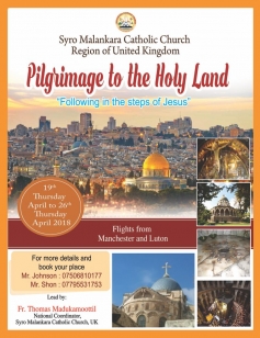 സീറോ മലങ്കര കത്തോലിക്കാ സഭയുടെ യുകെ റീജിയന്റെ നേതൃത്വത്തില് യേശുവിന്റെ പാദസ്പര്ശനമേറ്റ പുണ്യഭൂമിയായ, വിശുദ്ധനാടുകളിലൂടെയുള്ള അനുഗ്രഹ തീര്ത്ഥയാത്ര ഏപ്രില് മാസം 19 വ്യാഴാഴ്ച മുതല് ഏപ്രില് 26 വ്യാഴാഴ്ച വരെ നടക്കും. സീറോ മലങ്കര കത്തോലിക്കാ സഭയുടെ