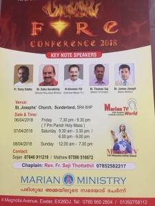 വചനശുസ്രൂക്ഷയിലൂടെ ലോകത്തിനു തന്നെ മാതൃകയായ മരിയന് ടി വി ടീം നേതൃത്വം നല്കുന്ന ഫയര് കോണ്ഫറന്സ് -2018 ധ്യാന ശുസ്രൂക്ഷ സന്ദര്ലാന്ഡ് സെ. ജോസഫ്സ് ദേവാലയത്തില് ഏപ്രില് 6 , 7 ,8 തീയതികളില് നടക്കും . ഫാ. ടോമി എടാട്ട് നേതൃത്വം നല്കുന്ന ശുശ്രൂഷകളില് ബ്രദര് . സാബു ആറുതൊട്ടിയില് , ബ്രദര് . ഡൊമിനിക് , ബ്രദര് .തോമസ് സാജ് , ബ്രദര് . ജോമോന് തുടങ്ങിയവര് തിരുവചനം പങ്കുവെക്കും .