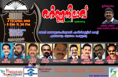 യുകെയിലെ സംഗീത രംഗത്തും നൃത്ത രംഗത്തും മുന്നില് നില്ക്കുന്ന കലാകാരന്മാരെയും കലാകാരികളെയും പങ്കെടുപ്പിച്ചു ലണ്ടന് മലയാള സാഹിത്യവേദി സംഘടിപ്പിക്കുന്ന സംഗീത നൃത്ത സന്ധ്യ വര്ണ്ണനിലാവ് ഏപ്രില് 7 ശനിയാഴ്ച വൈകുന്നേരം 5 മണി മുതല് ഈസ്റ്റ്ഹാമിലെ ട്രിനിറ്റി സെന്ററില് വച്ച് നടത്തപ്പെടുന്നു. യുക്മ ദേശീയ പ്രസിഡണ്ട് മാമന് ഫിലിപ്പ് ഉദ്ഘാടനം ചെയ്യുന്നതതോടുകൂടി കലാ സന്ധ്യയ്ക്ക് തുടക്കമാവും. യുക്മ നാഷണല് കലാമേളയടക്കം നിരവധി മത്സരങ്ങളില് സമ്മാനങ്ങള് നേടിയ ആന് മേരി ജോജോ, അശ്വിനി അജിത്, ജോവാന പ്രകാശ് തുടങ്ങിയവരുടെ ഭരതനാട്യം ആന് മേരി ജോജോ, അശ്വിനി അജിത് അവതരിപ്പിക്കുന്ന സിനിമാറ്റിക് ഡാന്സ്, യുകെയിലെ ഏറ്റവും പ്രായം കുറഞ്ഞ കലാകാരി ദേവനന്ദ അവതരിപ്പിക്കുന്ന സെമിക്ലാസിക്കല് ഡാന്സ് തുടങ്ങിയ നൃത്ത പരിപാടികള് വേദിയില് അരങ്ങേറും. യുകെയിലെ പ്രഗത്ഭ ഗായകാരായ റോയി സെബാസ്റ്റ്യന്, അനീഷ് ജോര്ജ്ജ് , ജോമോന് മാമൂട്ടില്, ഉണ്ണികൃഷ്ണന്, ടെസ്സമോള് ജോര്ജ്ജ്, ഡെന്ന ആന് ജോമോന്, വക്കം ജി. സുരേഷ്കുമാര് തുങ്ങിയവര് പഴയതും പുതിയതുമായ ഗാനങ്ങള് ആലപിക്കും. കുട്ടി ഗായകരായ ടെസ്സ സൂസന് ജോണ്, ജോവാന സോജന് എന്നിവരുടെ സാന്നിധ്യം വര്ണ്ണനിലാവിനെ മികവുറ്റതാക്കും.