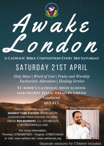 സെഹിയോന് യുകെയുടെ അഭിഷേകാഗ്നി ഇംഗ്ലീഷ് ടീം നയിക്കുന്ന എവെയ്ക്ക് ലണ്ടന് കണ്വന്ഷന് 21 , ശനിയാഴ്ച ഉച്ചക്ക് 2 മണി മുതല് 6 മണി വരെ പ്രശസ്ത വചന പ്രഘോഷകനായ ഫാ. ഷൈജു നടുവത്താനിയില് നയിക്കും.ലണ്ടനിലെ പാമേഴ്സ് ഗ്രീന് സെന്റ് ആന്സ് ഹൈസ്കൂള് ഓഡിറ്റോറിയത്തില് മുതിര്ന്നവര്ക്കും കുട്ടികള്ക്ക് വിവിധ ക്ലാസ് മുറികളിലുമായി ക്രമീകരിച്ചിരിക്കുന്നു.