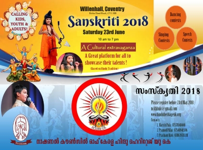 നാഷണല് കൗണ്സില് ഓഫ് കേരളാ ഹിന്ദു ഹെറിറ്റേജിന്റെ ആഭിമുഖ്യത്തില് 'സംസ്കൃതി 2018 'കലാ മാമാങ്കത്തിനുള്ള ഒരുക്കങ്ങള് പൂര്ത്തിയായി. ജൂണ് 23 നു രാവിലെ 9 മുതല് കവന്ട്രിയിലെ വില്ലെന് ഹാളില് ആരംഭിക്കുന്ന കലാ മത്സരങ്ങളില് സബ് ജൂനിയര് , ജൂനിയര് , സീനിയര് എന്നീ വിഭാഗങ്ങളിലായി ഭക്തിഗാനം, ഭരതനാട്യം, പ്രസംഗം, കഥാ രചന, കവിത രചന എന്നീ മത്സരങ്ങളില് പങ്കെടുക്കുവാന് അവസരമുണ്ടായിരിക്കുന്നതാണ്. ഭാരതീയ ഹൈന്ദവ ദര്ശനങ്ങളെ അടിസ്ഥാനമാക്കി ഒരുക്കുന്ന ഈ കലാ മാമാങ്കത്തില് പങ്കെടുക്കുവാന് യുകെയിലെ ഹൈന്ദവ സമാജങ്ങളിലെ അംഗങ്ങളെ ഭാരവാഹികള് സ്വാഗതം ചെയ്തു.