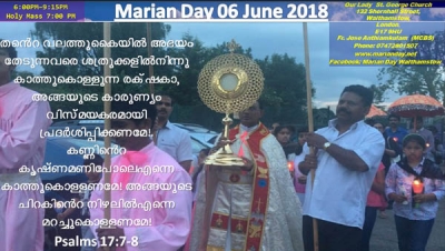 ലണ്ടനിലെ മരിയന് തീര്ഥാടന കേന്ദ്രമായ വാല്താംസ്റ്റോയിലെ ഔവര് ലേഡി ആന്ഡ് സെന്റ് ജോര്ജ് പള്ളിയില് നാളെ (ബുധനാഴ്ച) മരിയന് ദിന ശുശ്രൂഷയും ദിവ്യകാരുണ്യ തിരുനാളും ഭക്ത്യാദരപൂര്വ്വം കൊണ്ടാടുന്നു. ദിവ്യനാഥനെ കണ്ടാരാധിക്കുവാനും മഹത്വപ്പെടുത്താനും ഈ അവസരം വിനിയോഗിക്കാം.