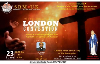സ്പിരിച്യുല് റിന്യൂവല് മിനിസ്ട്രി യുടെ ഏകദിന കത്തോലിക്ക മലയാളം ലണ്ടന് കണ്വെന്ഷന് ജൂണ് 23ന് ചര്ച് ഓഫ് ദി അസംപ്ഷന് കത്തോലിക്ക ദേവാലയത്തില് രാവിലെ 10.30 മണി മുതല് വൈകിട്ട് 4 മണി വരെ നടക്കും.