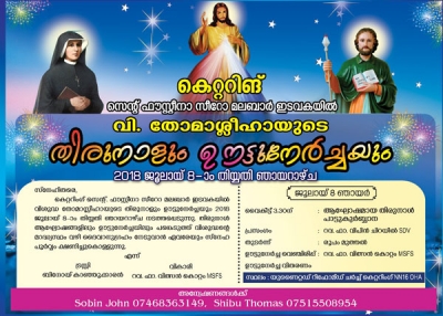 വിശുദ്ധ ഫൗസ്റ്റിനായുടെ നാമധേയത്തിലുള്ള കെറ്ററിങ്ങിലെ സിറോമലബാര് ഇടവകയില് വിശുദ്ധ തോമാശ്ലീഹായുടെ തിരുന്നാള് ആഘോഷവും ഊട്ടു നേര്ച്ച സദ്യയും ഞായറാഴ്ച 3.30 ന്. ഫാ. വിപിന്ചിറയില് SDV യുടെ മുഖ്യ കാര്മികത്വത്തില് നടത്തപെടുന്ന വിശുദ്ധ കുര്ബാനക്ക് ശേഷം ഇടവക വികാരിഫാ.വിത്സന് കൊറ്റം ഭക്ഷണം വെഞ്ചിരിച്ചു വിതരണം ചെയ്യും.