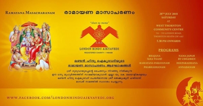 ലണ്ടന് ഹിന്ദു ഐക്യവേദിയുടെ ഈ മാസത്തെ സത്സംഗം രാമായണ മാസാചരണമായി 28ന് ആഘോഷിക്കും. വൈകിട്ട് 5:30 മുതല് ഭജന, രാമായണ പാരായണം, പ്രഭാഷണം, കുട്ടികളുടെ നാമജപം, ദീപാരാധന, അന്നദാനം എന്നിവയാണ് കാര്യപരിപാടികള്. ആഘോഷങ്ങള്ക്കുള്ള ഒരുക്കങ്ങള് പൂര്ത്തിയായി.