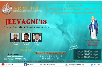 മൂന്ന് ദിവസത്തെ സ്പിരിച്യുല് റിന്യൂവല് മിനിസ്ട്രിയുടെ മലയാളം കത്തോലിക്ക കണ്വെന്ഷന് ലണ്ടനില് വച്ച് നടത്തപ്പെടുന്നു ജൂലൈ 26 നു 10 മണി മുതല് 28 നു വൈകുന്നേരം 4