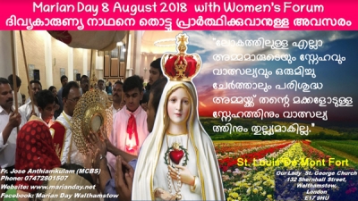 സീറോ മലബാര് മലബാര് സഭ ഗ്രേറ്റ് ബ്രിട്ടന് രൂപതയിലെ 8 റീജിയണുകളില് നിന്നുള്ള വുമണ്സ് ഫോറം ഭാരവാഹികള് മരിയന് ദിന ശുശ്രൂഷകളില് പങ്കെടുത്ത് അനുഗ്രഹങ്ങള് പ്രാപിക്കുവാന് ഈ അവസരം വിനിയോഗിക്കും.