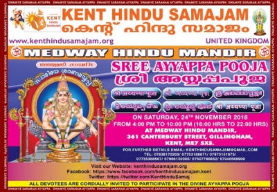 കെന്റ് ഹിന്ദു സമാജത്തിന്റെ ആഭിമുഖ്യത്തില് ഈ വര്ഷത്തെ അയ്യപ്പപൂജ നവംബര് 24 ശനിയാഴ്ച വൈകുന്നേരം 4 മണി മുതല് 10 മണി വരെ, കെന്റിലെ മെഡ്വേ ഹിന്ദു മന്ദിറില് വച്ച് നടക്കും. അയ്യപ്പപൂജയോടനുബന്ധിച്ചു ഭജന, വിളക്കുപൂജ, നെയ്യഭിഷേകം, താലപ്പൊലി, സഹസ്രനാമാര്ച്ചന, അഷ്ടോത്തര അര്ച്ചന, ശനിദോഷ പരിഹാരം (നീരാന്ജനം), ദീപാരാധന, പടിപൂജ, ഹരിവരാസനം, പ്രസാദവിതരണം, അന്നദാനം എന്നിവയും ഉണ്ടായിരിക്കുന്നതാണ്. വിളക്കുപൂജയില് പങ്കെടുക്കുന്നവര് നിലവിളക്കും നാളികേരവും പൂജാപുഷ്പങ്ങളും കൊണ്ടുവരേണ്ടതാണ്.