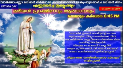 ലണ്ടനിലെ മരിയന് തീര്ഥാടന കേന്ദ്രമായ വല്താംസ്റ്റോയിലെ ( ഔവര് ലേഡി ആന്ഡ് സെന്റ് ജോര്ജ് പള്ളിയില്) മെയ് മാസം 15 -ാം തീയതി ബുധനാഴ്ച മരിയന് ദിനശുശ്രൂഷയും ഫാത്തിമയില് മാതാവ് പ്രത്യക്ഷപ്പെട്ടതിന്റെ 102-)o വാര്ഷികം ഫാത്തിമാ ദിനമായും മരിയന് പ്രദക്ഷിണത്തോടുകൂടിയും ഭക്ത്യാദരപൂര്വ്വം കൊണ്ടാടുന്നതാണ്.