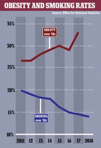 പുകവലിയെ അപേക്ഷിച്ചു പൊണ്ണത്തടി മൂലം യുകെയില് പ്രതിവര്ഷം 1900 കുടലിലുള്ള കാന്സര് കേസുകള് റിപ്പോര്ട്ട് ചെയ്യപ്പെടുന്നുണ്ട് . കിഡ്നി കാന്സര് 1400 , അണ്ഡശയ കാന്സര് 460 ലിവര് കാന്സര് 180 എന്നിങ്ങനെയാണ് പൊണ്ണത്തടിയുടെ ഫലമായി റിപ്പോര്ട്ട് ചെയ്യപ്പെടുന്നത്. എന്നുവെച്ചു പുകവലി നല്ലതാണെന്നല്ല, അത് ശരീരത്തില് വലിയ തോതില് കേടുപാട് വരുത്തും .