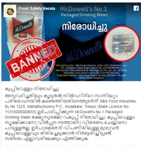 അനുവദിച്ചതിലും കൂടുതല് സില്വറിന്റെ സാന്നിദ്ധ്യം പരിശോധനയില് കണ്ടെത്തിയതിനെത്തുടര്ന്ന് S&S Food Industries, Sy.No 1225, Mattathurkunnu P.O., Kodakara, Trissur (State Licence No: 11315008000653) ഉദ്പാദിപ്പിക്കുന്ന McDowell's No.1 Packaged Drinking Water ഭക്ഷ്യസുരക്ഷാ വകുപ്പ് നിരോധിച്ചു.