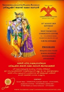 ശ്രീകൃഷ്ണജയന്തി ആഘോഷമാക്കുവാന് ലണ്ടന് ഹിന്ദു ഐക്യവേദി ഒരുങ്ങി. പതിവ് പോലെ ഈ വര്ഷവും ശ്രീകൃഷ്ണ ജയന്തിയും രക്ഷാബന്ധന് വിപുലമായ പരിപാടികളോടെ ആഘോഷിക്കും. ചടങ്ങുകള്ക്ക് വിശിഷ്ടാതിഥിആയി ഗുരുവായൂര് കീഴേടം ക്ഷേത്രത്തിലെ മേല്ശാന്തിയായി സേവനം അനുഷ്ടിച്ചിട്ടുള്ള വാസുദേവന് നമ്പൂതിരി (വടശ്ശേരിമനഃ ) ഈ മാസത്തെ കാര്യപടികള് പ്രത്യേക ഭജന , രക്ഷാബന്ധന് ആഘോഷം, ദീപാരാധന, അന്നദാനം എന്നീ വിവിധ പരിപാടികളോടെ ആഗസ്റ്റ് 31 ശനിയാഴ്ച വൈകുന്നേരം വൈകിട്ട് 5.30 മുതല് ക്രോയ്ഡോണിലെ (ലണ്ടന്) തോണ്ടന്ഹീത്ത് കമ്മ്യൂണിറ്റി സെന്ററില് വച്ച് നടത്തുവാന് തീരുമാനിച്ചിരിക്കുന്നു.