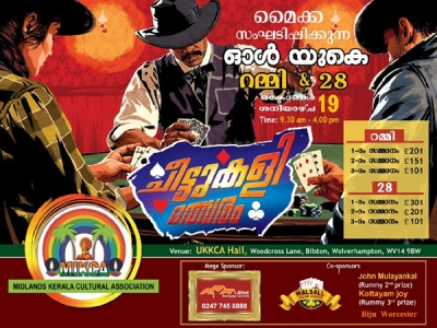 മിഡ്ലാണ്ട്സിലെ മുന്നിര മലയാളി സംഘടനയായ മൈക്ക (Midlands Kerala Cultural Association ) സംഘടിപ്പിക്കുന്ന ഓള് യുകെ ചീട്ടുകളി മത്സരം ഒക്ടോബര് 19 ന് വോള്വര്ഹാംപ്ടണിലെ യുകെകെസിഎ ഹാളില് നടക്കും. രാവിലെ 9.30 മുതല് വൈകിട്ട് 4 മണിവരെ നടക്കുന്ന മത്സരത്തില് യുകെയിലെ വിവിധ ഭാഗങ്ങളില് നിന്നുള്ള ചീട്ടുകളി ടീമുകളും ചീട്ടുകളി പ്രേമികളും പങ്കെടുക്കും.
