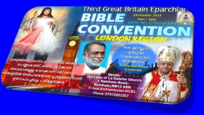 ലണ്ടന് റീജണല് കണ്വെന്ഷന് ഒക്ടോബര് 24 നു വ്യാഴാഴ്ച രാവിലെ 9മണിക്ക് ആരംഭിച്ചു വൈകുന്നേരം 5:00 മണിക്ക് സമാപിക്കുന്ന രീതിയിലാണ് ക്രമീകരിച്ചിരിക്കുന്നത്. ഗ്രേറ്റ് ബ്രിട്ടണ് സീറോ മലബാര് രൂപതയുടെ നേതൃത്വത്തില് രൂപതാ തലത്തില് നടത്തപ്പെടുന്ന ബൈബിള് കണ്വെന്ഷന്റെ ലണ്ടന് റീജണല് കണ്വെന്ഷന് പ്രശസ്ത വചന പ്രഘോഷകന് ജോര്ജ്ജ് പനക്കല് അച്ചന് നയിക്കും.രൂപതാദ്ധ്യക്ഷന് മാര് ജോസഫ് സ്രാമ്പിക്കല് കണ്വെന്ഷനില് അനുഗ്രഹ പ്രഭാഷണം നടത്തുന്നതാണ്. ഫാ.ജോസഫ് എടാട്ട്, ഫാ. ആന്റണി പറങ്കിമാലില് എന്നിവരും വിവിധ ശുശ്രുഷകളില് പങ്കു ചേരും.