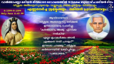 ലണ്ടനിലെ മരിയന് തീര്ഥാടന കേന്ദ്രമായ വാല്താംസ്റ്റോയിലെ ഔവര് ലേഡി ആന്ഡ് സെന്റ് ജോര്ജ് പള്ളിയില് നാളെ (ബുധനാഴ്ച) മരിയന് ദിനശുശ്രൂഷയും മിഷന്റെ മദ്ധ്യസ്ഥനായ ബ്ലസ്സഡ് കുഞ്ഞച്ചന്റെ തിരുനാളും മരിയന് പ്രദക്ഷിണവും ഭക്ത്യാദരപൂര്വ്വം കൊണ്ടാടുന്നതാണ്.