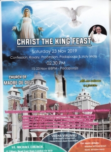നവംബര് 23ന് ഉച്ചകഴിഞ്ഞു രണ്ടരയ്ക്ക് ഈസ്റ്റ് ഹാമിലെ സെന്റ് മൈക്കിള്സ് ചര്ച്ചിലാണ് തിരുനാള് ആഘോഷം. കുമ്പസാരം, ജപമാല, പ്രദക്ഷിണം, പാദപൂജ, വിശുദ്ധ കുര്ബാന, സ്നേഹവിരുന്ന് എന്നിവയുണ്ടാകും. ക്രിസ്തു രാജത്വ തിരുനാളിന് ഏവരുടെയും പ്രാര്ത്ഥനയും സാന്നിധ്യ സഹായ സഹകരണങ്ങളും പ്രതീക്ഷിക്കുന്നതായി തിരുനാള് കമ്മറ്റി അറിയിച്ചു.