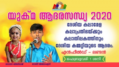 യുക്മയുടെ യശ്ശസ്സ് ആഗോളതലത്തില് ഉയര്ത്തിയ യുക്മ ദേശീയ കലാമേളകളുടെ ചരിത്രത്തില് ആദ്യമായി കലാതിലകംകലാപ്രതിഭ പട്ടങ്ങള് ഒരേ റീജിയണില് നിന്നുള്ളവര് നേടിയെടുത്തുകൊണ്ട് മാഞ്ചസ്റ്ററില് നടന്ന പത്താമത് ദേശീയ കലാമേള ശ്രദ്ധേയമായിരുന്നു. എന്ഫീല്ഡ് മലയാളി അസോസിയേഷനില് നിന്നുള്ള ദേവപ്രിയ ബിബിരാജ് കലാതിലകപ്പട്ടം സ്വന്തമാക്കിയപ്പോള് ലൂട്ടണ് കേരളൈറ്റ്സില് നിന്നുള്ള ടോണി അലോഷ്യസ് കലാപ്രതിഭയായി തിളങ്ങി. യുക്മയുടെ ഈ രണ്ടു അപൂര്വ്വ താരങ്ങളെയും ആദരിക്കുന്ന ഒരു ചടങ്ങ് ലണ്ടനില് സംഘടിപ്പിക്കുമെന്ന്, യുക്മ ദേശീയ കലാമേളയുടെ അവലോകനത്തോടനുബന്ധിച്ച് പ്രസിഡന്റ് മനോജ്കുമാര് പിള്ളയും ജനറല് സെക്രട്ടറി അലക്സ് വര്ഗ്ഗീസും പ്രഖ്യാപിച്ചിരുന്നു. 'ആദരസന്ധ്യ 2020' ലണ്ടനില് സംഘടിപ്പിക്കപ്പെടുമ്പോള് അത് യാഥാര്ഥ്യമാകുകയാണ്.