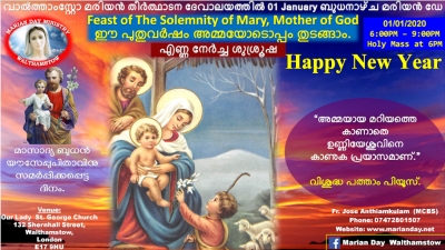 ലണ്ടനിലെ മരിയന് തീര്ഥാടന കേന്ദ്രമായ വാല്ത്താംസ്സ്റ്റോയിലെ ഔവര് ലേഡി ആന്ഡ് സെന്റ് ജോര്ജ് പള്ളിയില് ജനുവരി ഒന്നിനു ബുധനാഴ്ച പുതുവത്സരത്തിലെ ആദ്യത്തെ മരിയന് ദിനശുശ്രൂഷ ഭക്ത്യാദരപൂര്വ്വം കൊണ്ടാടും.