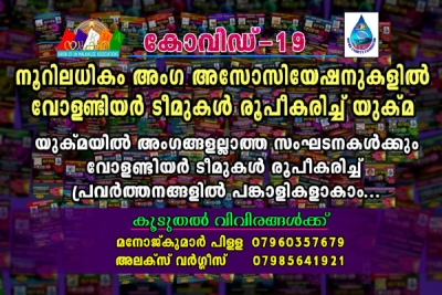 കൊറോണ വൈറസ് മൂലം ദുരിതമനുഭവിക്കുന്ന യു.കെയിലെ മലയാളി സമൂഹത്തിന് കൈത്താങ്ങായി യുക്മയുടെ കീഴിലുള്ള യുക്മ ചാരിറ്റി ഫൗണ്ടേഷന്റെ നേതൃത്വത്തില് നടന്നുവരുന്ന സന്നദ്ധപ്രവര്ത്തനങ്ങള് കൂടുതല് തലങ്ങളിലേയ്ക്ക് വ്യാപിപ്പിക്കുന്നു. കഴിഞ്ഞ മൂന്ന് ആഴ്ച്ചകള്ക്കുള്ളില് തന്നെ നൂറിലധികം അംഗ അസോസിയേഷനുകളില് സന്നദ്ധ പ്രവര്ത്തനങ്ങള് ശക്തമാക്കുന്നതിന് വോളണ്ടിയര് ടീമുകള് രൂപീകരിക്കുന്നതിനും അതുവഴി സഹായം ആവശ്യമുള്ള നിരവധി ആളുകളിലേയ്ക്ക് അത് എത്തിച്ചു നല്കുന്നതിനും ഇതിനോടകം തന്നെ സാധിച്ചിട്ടുണ്ടെന്ന് യുക്മ ദേശീയ പ്രസിഡന്റ് മനോജ്കുമാര് പിള്ള, ജനറല് സെക്രട്ടറി അലക്സ് വര്ഗ്ഗീസ് എന്നിവര് അറിയിച്ചു. യുക്മ ദേശീയ ഭരണസമിതി അംഗം കൂടിയായ ഡോ. ബിജു പെരിങ്ങത്തറയുടെ നേതൃത്വത്തില് നടന്നു വന്നിരുന്ന മെഡിക്കല് ഹെല്പ്പ് ലൈന് പ്രവര്ത്തനങ്ങള് കൂടുതല് ഡോക്ടര്മാരെയും നഴ്സുമാരെയും ചേര്ത്ത് വിപുലീകരിച്ചിട്ടുണ്ട്.