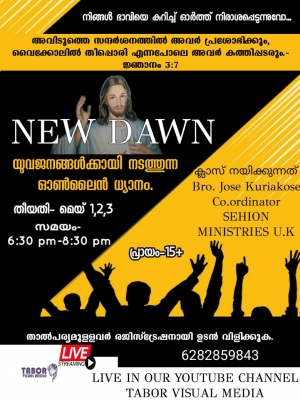 ലോകത്തെ ഭയാനകമാം വിധം ബാധിക്കുന്ന മഹാ വിപത്തുകളെ പ്രാര്ത്ഥനയില് പ്രതിരോധിച്ചുകൊണ്ട് , ദൈവിക സംരക്ഷണത്തില് വളരുകയെന്ന ലക്ഷ്യത്തോടെ സെഹിയോന് മിനിസ്ട്രിയുടെ നേതൃത്വത്തില് 15 വയസുമുതല് പ്രായമുള്ള യുവതീ യുവാക്കള്ക്കായി നടത്തപ്പെടുന്ന മൂന്ന് ദിവസത്തെ പ്രത്യേക ധ്യാനം മെയ് 1,2,3 തീയതികളിലായി ലോക്ഡൗണിന്റെ പശ്ചാത്തലത്തില് ഓണ്ലൈനായി നടക്കുന്നു .