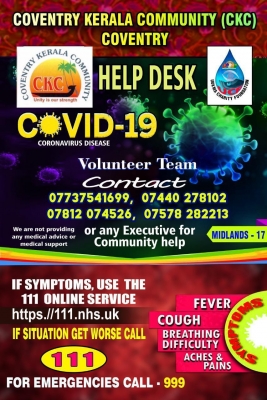 കൊവെന്ട്രിയിലും പരിസര പ്രദേശങ്ങളിലും , കോരന്റീനില് കഴിയുന്നവര്ക്കും,ജോലിക്കു പോകാന് പറ്റാതെ ബുദ്ധി മുട്ടുന്നവര്ക്കും സഹായ ഹസ്തവുമായി സി കെ സി ഒപ്പമുണ്ടാകും .ആരെങ്കിലും കൊവെന്ട്രിയിലും പരിസര പ്രദേശങ്ങളിലും ബുദ്ധിമുട്ടുണ്ടെങ്കില് സി കെ സി യുമായി ബന്ധപ്പെടുക .