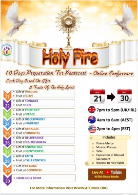 ആനുകാലിക സംഭവ വികാസങ്ങളുടെ പശ്ചാത്തലത്തില് ലോകജനതയെ നിത്യ രക്ഷകനായ യേശുവില് ഐക്യപ്പെടുത്തി, പരിശുദ്ധാത്മാവിന്റെ ഫലങ്ങളും ദാനങ്ങളും സ്വീകരിച്ച് പുതിയൊരു പന്തക്കുസ്താനുഭവത്തിലേക്കു നയിക്കുകയെന്ന ലക്ഷ്യവുമായി അഭിഷേകാഗ്നി കാത്തലിക് മിനിസ്ട്രിയുടെ നേതൃത്വത്തില് 21 മുതല് നടന്നുവരുന്ന , പ്രമുഖ വചന പ്രഘോഷകരും ശുശ്രൂഷകരും നയിക്കുന്ന 'ഹോളി ഫയര്' ഇംഗ്ളീഷ് ഓണ്ലൈന് ധ്യാന ശുശ്രൂഷ 30 ന് സമാപിക്കും.
