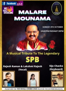 തെന്നിന്ത്യയുടെ പ്രീയഗായകന് അന്തരിച്ച എസ് പി ബാലസുബ്രമണ്യത്തിന് ആദരാജ്ഞലികള് അര്പ്പിച്ചുകൊണ്ടുള്ള സംഗീതാര്ച്ചന 'മലരെ മൗനമാ' പ്രത്യേക സംഗീത പരിപാടി ഇന്ന് (ഞായറാഴ്ച്ച) ഉച്ചകഴിഞ്ഞു യുകെ സമയം 3 മണിക്ക് (ഇന്ത്യന് സമയം 7:30പിഎം)WE SHALL OVERCOME ഫേസ്ബുക്ലൈവില്. യുകെയില് നിന്നും പ്രശസ്ത ഗായകന് രാജേഷ് രാമനും ലക്ഷ്മി രാജേഷും ഒപ്പം കീബോര്ഡിസ്റ്റ് സിജോ ചാക്കോയും ചേര്ന്നവതരിപ്പിക്കുന്നു.