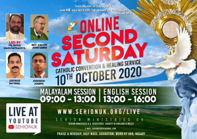 പരിശുദ്ധ ദൈവ മാതാവിനോടുള്ള ജപമാല ഭക്തിയില് , മഹാമാരിയുടെ ആപത്ഘട്ടത്തെ യേശുവില് അതിജീവിക്കുകയെന്ന അനുഗ്രഹ സുവിശേഷവുമായി സെഹിയോന് യുകെയുടെ നേതൃത്വത്തില് നടക്കുന്ന പ്രതിമാസ രണ്ടാം ശനിയാഴ്ച കണ്വെന്ഷന് 10 ന് നടക്കും.