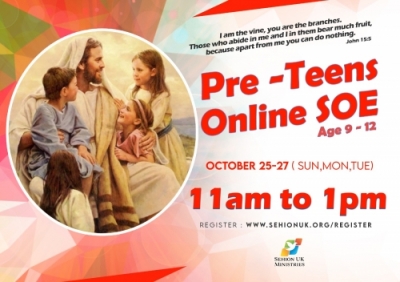 സെഹിയോന് മിന്സ്ട്രിയുടെ സ്കൂള് ഓഫ് ഇവാഞ്ചലൈസേഷന് ടീം കുട്ടികള്ക്കും ടീനേജുകാര്ക്കുമായി ഒക്ടോബര് മാസത്തിലെ സ്കൂള് അവധിക്കാലത്ത് 25 മുതല് 27 വരെയും ( ഞായര് , തിങ്കള് , ചൊവ്വ ) തുടര്ന്ന് 28 മുതല് 30 വരെയും (ബുധന് , വ്യാഴം , വെള്ളി ) തീയതികളില് ഓണ്ലൈനില് സൂം ആപ്പ് വഴി രണ്ട് ധ്യാനങ്ങള് നടത്തുന്നു.