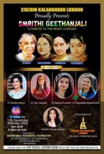 കൊച്ചിന് കലാഭവന് ലണ്ടനും, പ്രശസ്ത ഗായകനായ ജി വേണുഗോപാല് കാന്സര് രോഗികളായ കുട്ടികളെസഹായിക്കുന്നതിന് വേണ്ടി നടത്തുന്ന 'സസ്നേഹം ജി വേണുഗോപാല്' ഫൗണ്ടേഷനും ചേര്ന്നാണ് ഈഗാനോപഹാരം പ്രേക്ഷകര്ക്ക് മുന്പില് എത്തിക്കുന്നത്.ഡിസംബര് 12 ശനിയാഴ്ച്ച ഉച്ചകഴിഞ്ഞ് യുകെ സമയംമൂന്ന് മണിമുതല് (ഇന്ത്യന് സമയം 8:30) കൊച്ചിന് കലാഭവന് ലണ്ടന്റെ we shall overcome ഫേസ്ബുക് പേജില്ലൈവായി സ്മൃതി ഗീതാഞ്ജലി പ്രേക്ഷകര്ക്ക് മുന്നില് അവതരിപ്പിക്കും .