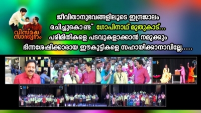 ഭിന്നശേഷിയുള്ള കുട്ടികളുമായി ഗോപിനാഥ് മുതുകാട് ഒരുക്കിയ 'വിസ്മയ സാന്ത്വനം' ആസ്വാദക ഹൃദയങ്ങളെ ആഴത്തില് സ്പര്ശിച്ച് അവിസ്മരണീയമായി. നമ്മുടെ മനസ്സിന്റെ കൊച്ചു നന്മകള് വലിയ മാറ്റങ്ങള്ക്കു കാരണമാകുവാനും അങ്ങനെ സുന്ദരമായ നമ്മുടെ ലോകം കൂടുതല് സുന്ദരമാക്കുവാന് നമുക്ക് പരിശ്രമിക്കാം. 'ജീവിതം ഒരു മാജിക് അല്ല; ജീവിതം ഒരു യാഥാര്ഥ്യമാണ്' ഭിന്നശേഷിയുള്ള കുട്ടികള്ക്ക് വേണ്ടി ശേഷിച്ച ജീവിതം ഉഴിഞ്ഞു വച്ചിരിക്കുന്ന പ്രശസ്ത മജീഷ്യന് ഗോപിനാഥ് മുതുകാടിന്റെ വാക്കുകള് ആണിത്.