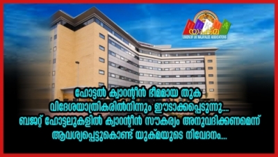 ഹോട്ടല് ക്വാറന്റീന് സംബന്ധിച്ച് നിലവില് ഏര്പ്പെടുത്തിയിരിക്കുന്ന നിബന്ധനകളില് അയവ് വരുത്തിക്കുവാനും, യാത്രക്കാരുടെ സൗകര്യാര്ത്ഥമുള്ള ഹോട്ടലുകള് തിരഞ്ഞെടുത്ത് താമസമൊരുക്കുവാന് സാധിക്കുന്ന തരത്തില് വ്യവസ്ഥയില് അയവ് വരുത്തണമെന്നും യുക്മ പ്രസിഡന്റ് മനോജ് കുമാര് പിള്ള, സെക്രട്ടറി അലക്സ് വര്ഗ്ഗീസ്, വൈസ് പ്രസിഡന്റ് അഡ്വ. എബി സെബാസ്റ്റ്യന് എന്നിവര് ഗവണ്മെന്റിന് നല്കിയ നിവേദനത്തിലൂടെ ആവശ്യപ്പെട്ടു.