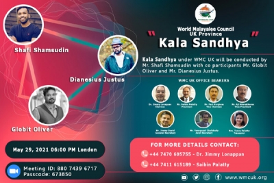 വേള്ഡ് മലയാളി കൗണ്സില് യുകെ പ്രോവിന്സിന്റെ ആഭിമുഖ്യത്തില് സൂം പ്ലാറ്റ്ഫോമിലൂടെ ഇന്ന് (ശനിയാഴ്ച) വൈകുന്നേരം ആറുമണിക്ക് 'കലാസന്ധ്യ ' നടത്തുന്നു. വേള്ഡ് മലയാളി കൗണ്സില് ലണ്ടന് റീജിയനില് നിന്നും ഷാഫി ഷംഷുദിന് ടീം നേതൃത്തം കൊടുക്കുന്ന കലാസന്ധ്യയില് വിവിധ റീജിയനില് നിന്നുള്ള കലാപരിപാടികള് അവ രിപ്പിക്കുന്നതാണ്. ഈ കലാസന്ധ്യയിലേക്ക് പ്രസിഡന്റ് സൈബിന് പാലാട്ടി ഏവരെയും സ്വാഗതം ചെയ്തു.