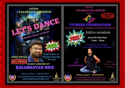 കൊച്ചിന് കലാഭവന് ലണ്ടന് സെന്ററിന്റെ ആഭിമുഖ്യത്തില് ഫ്രീ സ്റ്റൈല് ബോളിവുഡ് ഡാന്സ് ക്ലാസ്സുകളും സ്ത്രീകള്ക്കായുള്ള ഫിറ്റ്നസ് ഫൌണ്ടേഷന് കോഴ്സുകളും ആരംഭിക്കുന്നു. ഓണ്ലൈന് കോഴ്സുകള് ആണ് ഇപ്പോള് ആരംഭിക്കുന്നത്. ബോളിവുഡ് ഡാന്സ് ക്ലാസ്സുകള്ക്ക് നേതൃത്വം നല്കുന്നത് യുകെയിലെ അറിയപ്പെടുന്ന കൊറിയോഗ്രാഫറും നര്ത്തകനും ഒട്ടനവധി സ്റ്റേജ് ഷോകള്ക്ക് നൃത്ത സംവിധാനം നിര്വഹിച്ചിട്ടുള്ളതുമായ കലാഭവന് നൈസ് ആണ്.